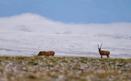 在距冰川发育地不远的安多县岗尼乡附近,中科院副研究员李欣海一行正操纵着无人机航拍,散布在公路两侧广大区域内的野生动物尽收眼底。此次他们主要负责调查这一地区的关键有蹄类动物即藏羚羊、藏原羚和藏野驴的数量与分布。