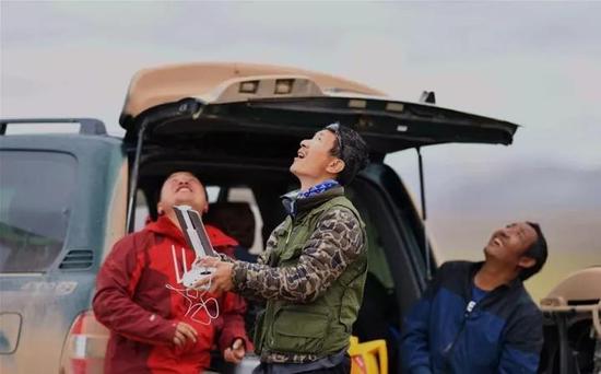 6月23日,中科院动物研究所副研究员李欣海(中)在使用无人机查看考察区域内的动物种群分布情况