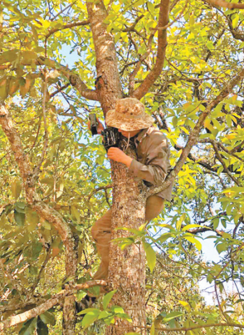 中国科学院昆明动物研究所研究人员在安放红外相机,进行鸟类监测