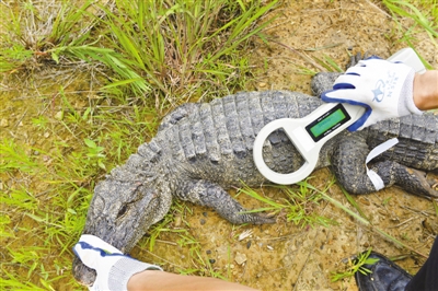 汪仁平说,2006年放归的一条雄性扬子鳄走出了放归区域,跑到3公里外一个鱼塘筑巢。“通过无线电发射器,这条扬子鳄被找到了。”
